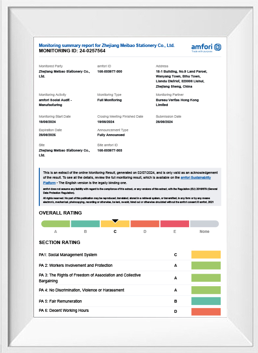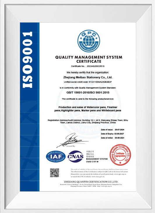 Zhejiang Meibao Stationery Co., Ltd. (primary Wenzhou FanRong Stationery Co., Ltd.) was founded in 2005, and has over 20 years of experience in the Stationery field mainly engaged in producing and selling Watercolor pens, fine liners, Highlighter, and Markers, It insists on a "quality first, reputation first" business purpose, and hold the tireless hard work of faith to make our production technology and product quality reached a new level. The factory has passed the BSCl WCA audit and the products are in conformity with European CE, EN71-1/2/3/9/11, BS7272, REACH, PAHs, MSDS, and American LHAMA, ASTM-D4236 safe standard testing requirements and are sold in America, Europe, the Middle East, and Southeast Asia Highly praised by customers.